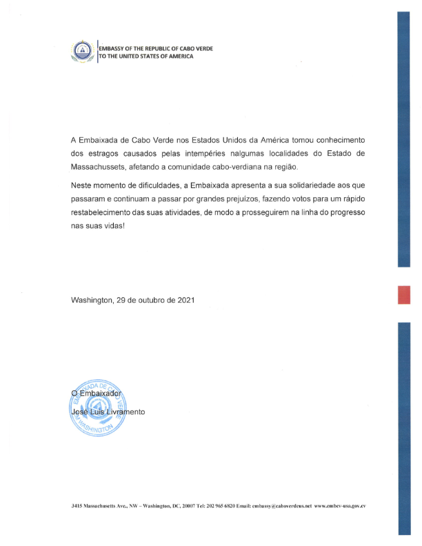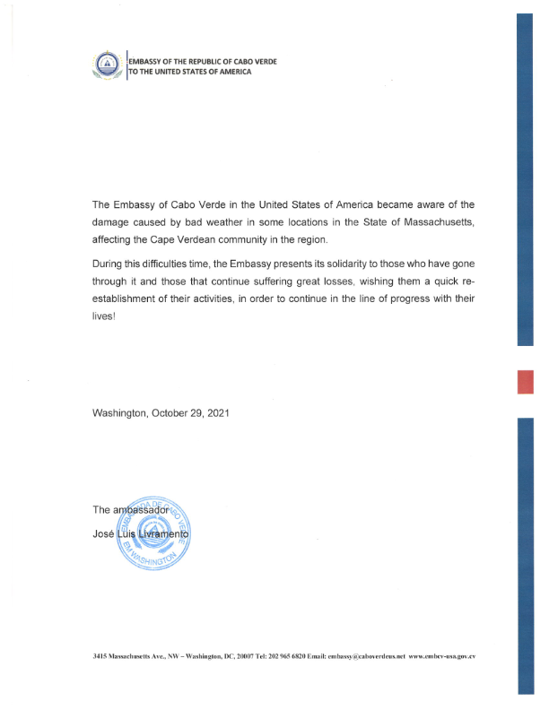 The Embassy of Cabo Verde in the United States of America became aware of the damage caused by bad weather in some locations in the State of Massachusetts, affecting the Cape Verdean community in the region.