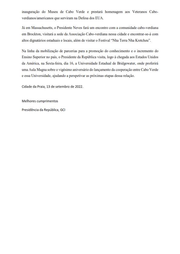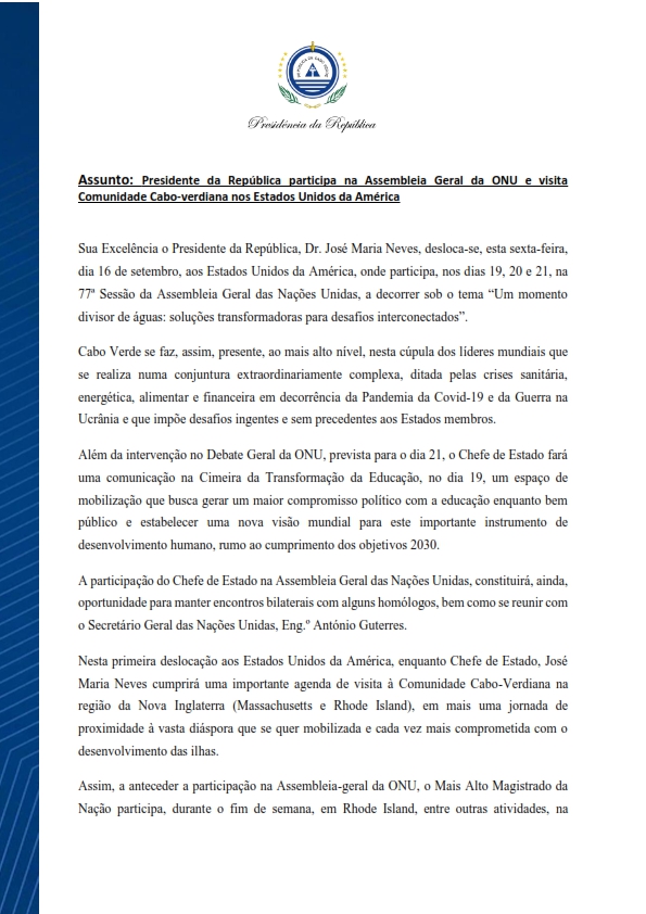 Assunto: Presidente da República participa na Assembleia Geral da ONU e visita Comunidade Cabo-Verdiana nos Estados Unidos da América