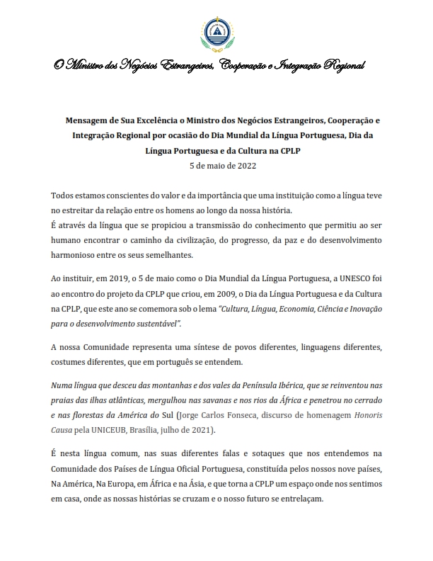 Mensagem de Sua Excelência o Ministro dos Negócios Estrangeiros, Cooperação e Integração Regional por ocasião do Dia Mundial da Língua Portuguesa, Dia da Língua Portuguesa e da Cultura na CPLP